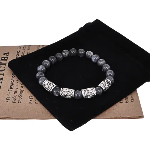 Размеры и комплектация: Внутренний диаметр около 5,5 см, диаметр бусин 8 мм. Упаковка: прозрачный пакет с еврослотом, бархатный мешочек, буклет с описанием рун Феху, Дагаз, Уруз и Ингуз.
