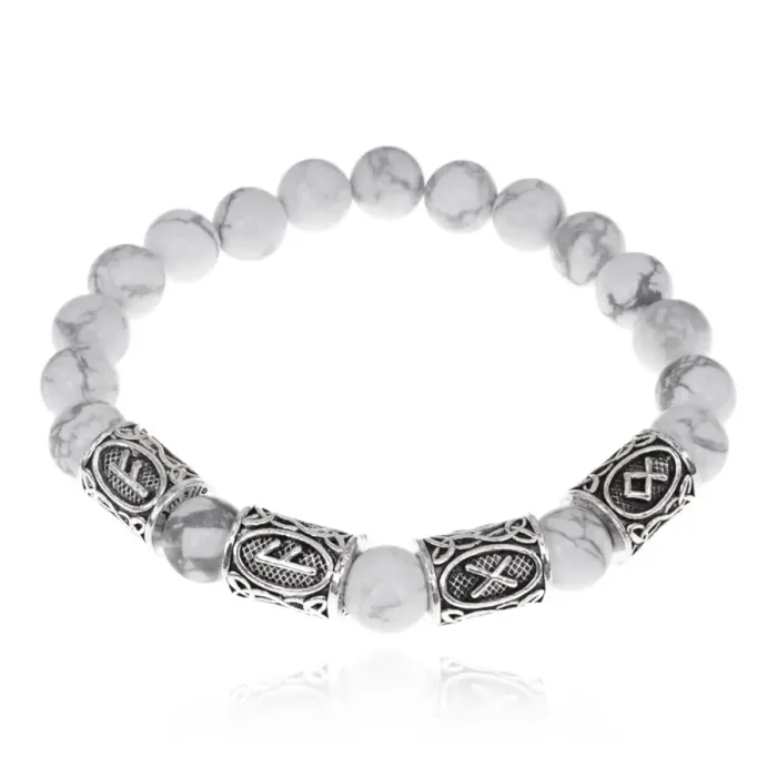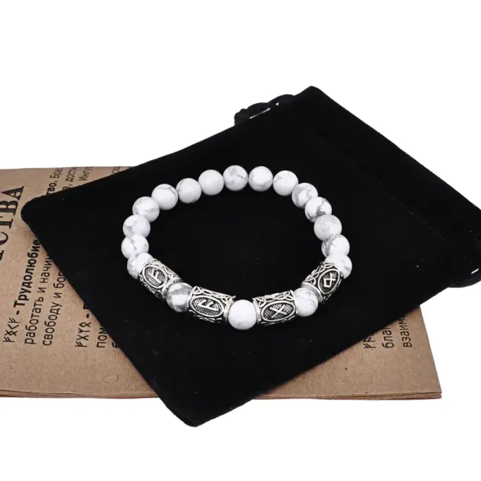 Рунический стрейч-браслет из бижутерного сплава с натуральным камнем кахолонг и символикой рун.