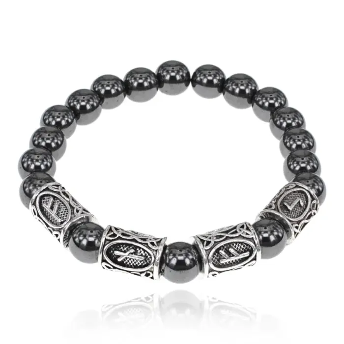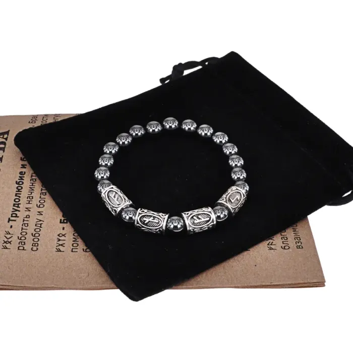 Рунический стрейч-браслет из бижутерного сплава с бусинами гематита и символикой богатства.