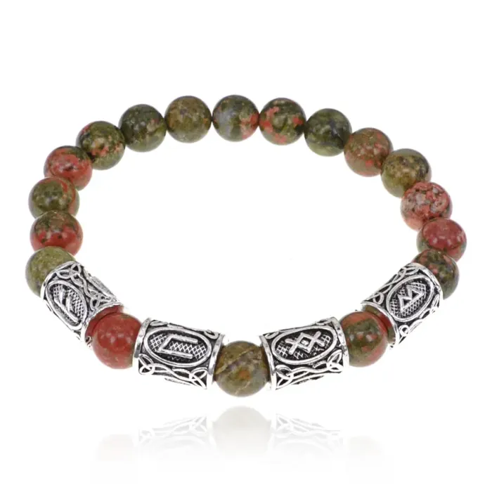 Рунический стрейч-браслет из бижутерного сплава с натуральным камнем унакит и символами рун.
