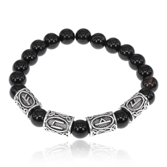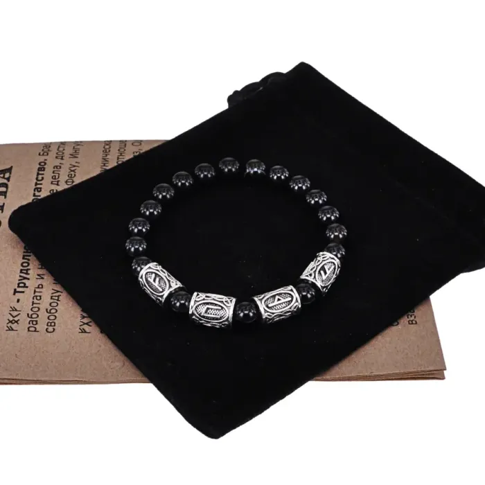 Рунический стрейч-браслет из бижутерного сплава с бусинами из черного агата.