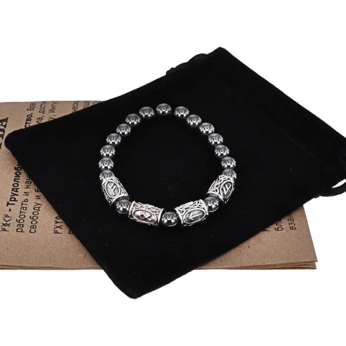Рунический стрейч-браслет из бижутерного сплава с бусинами из синтетического гематита.