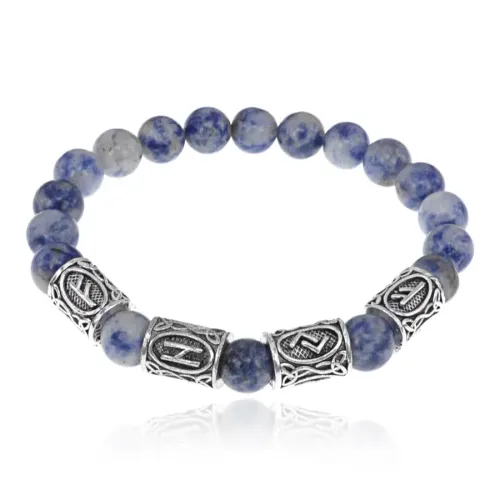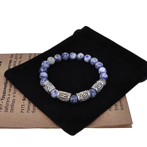 Рунический стрейч-браслет из бижутерного сплава и натурального камня содалит. Символика связана с темами богатства и финансовой свободы.