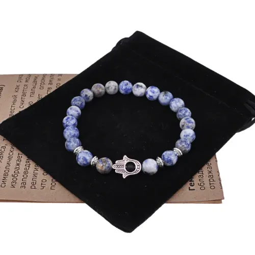 Браслет-амулет Хамса с натуральным камнем содалит. Дизайн включает подвеску в виде руки Фатимы.