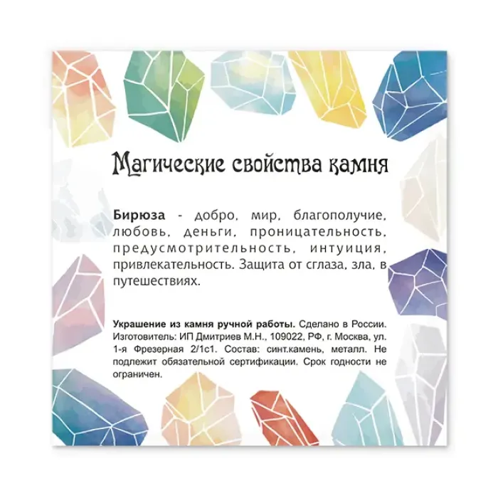Материал и изготовление: Синтетический камень бирюза, металл. Камень обработан методом галтовки.