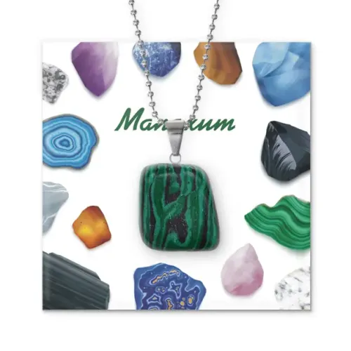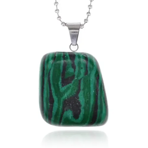 Кулон из синтетического малахита на металлической цепочке. Камень обработан галтовкой, форма и размер каждого экземпляра уникальны.