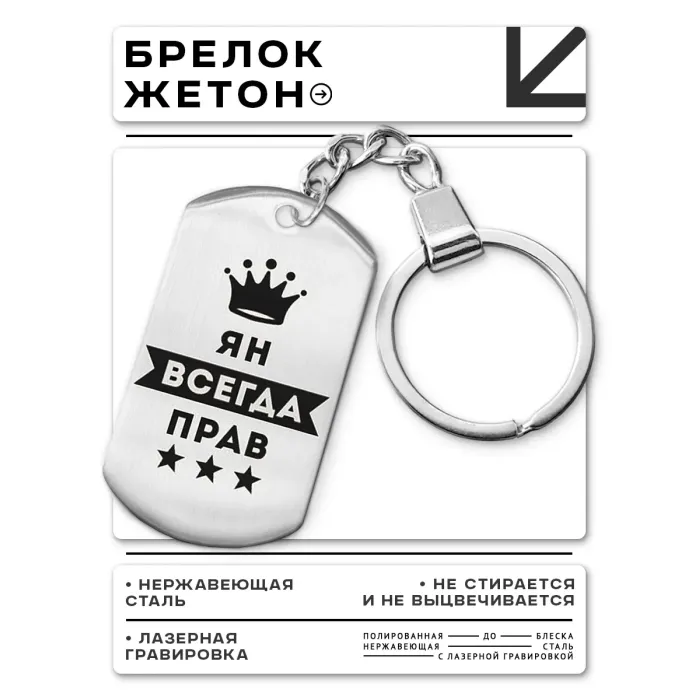 Размеры и комплектация: Размер жетона 50х28 мм. В комплекте кольцо для ключей. Упаковка — прозрачный пакет.