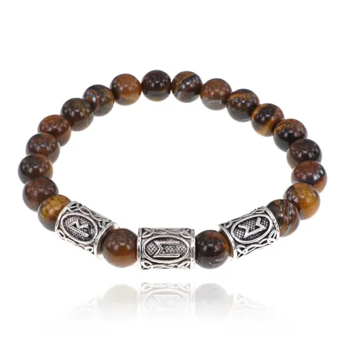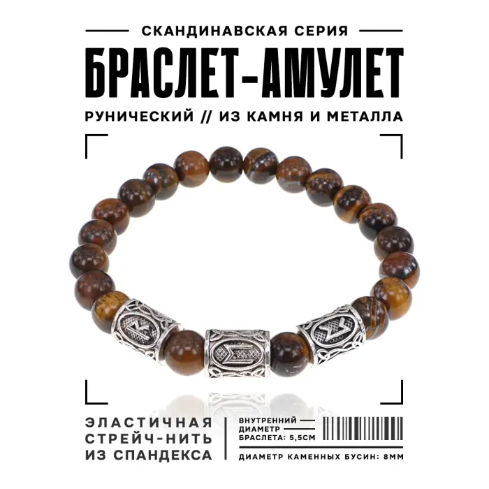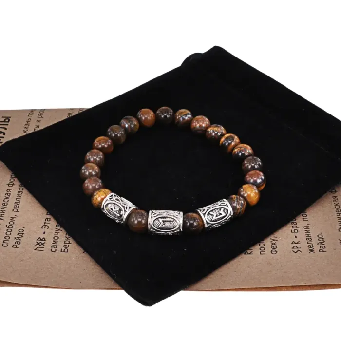 Рунический стрейч-браслет с бусинами из натурального камня тигровый глаз и символами рун.