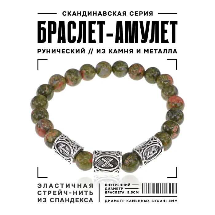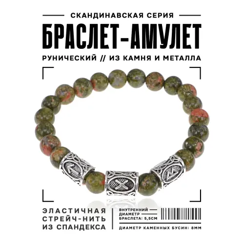 Рунический стрейч-браслет для коррекции отношений из натурального камня унакит с нанесёнными символами.