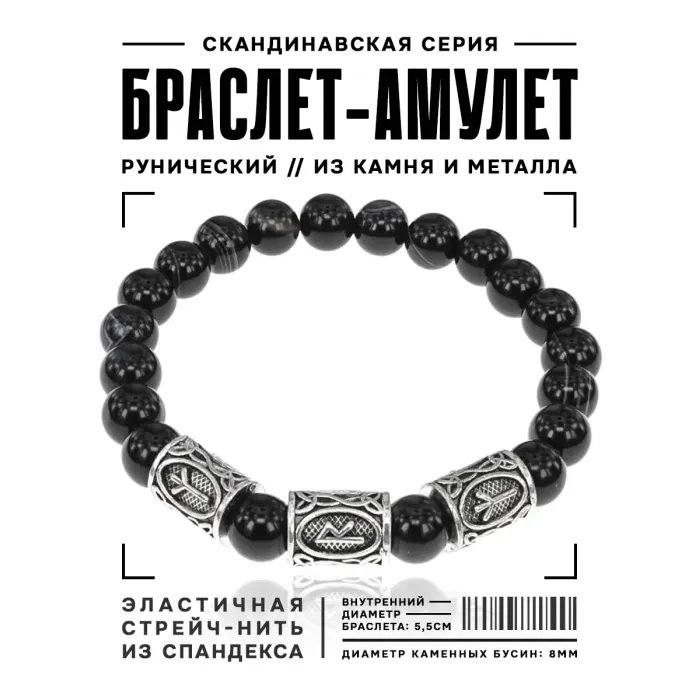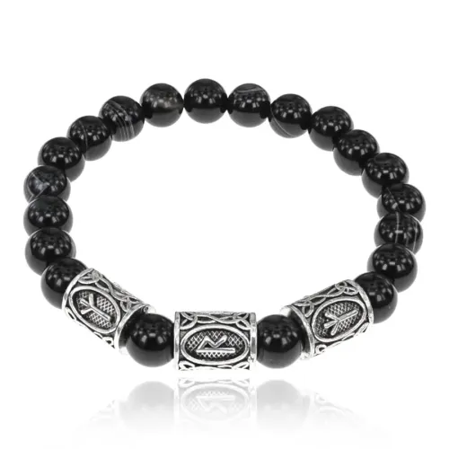Рунический браслет Божественная защита с нат.камнем Черный агат 8мм BSRH1-015