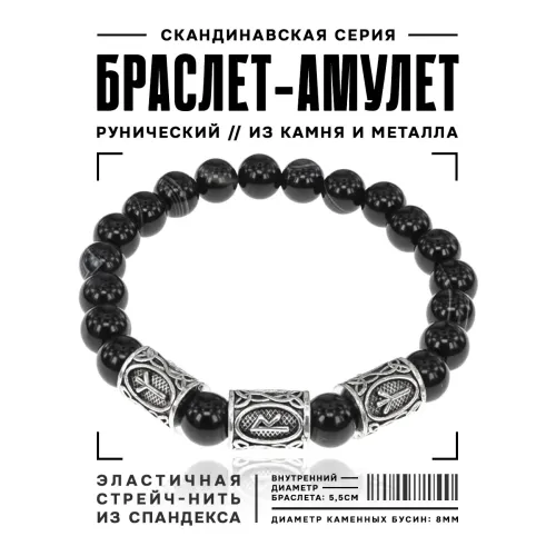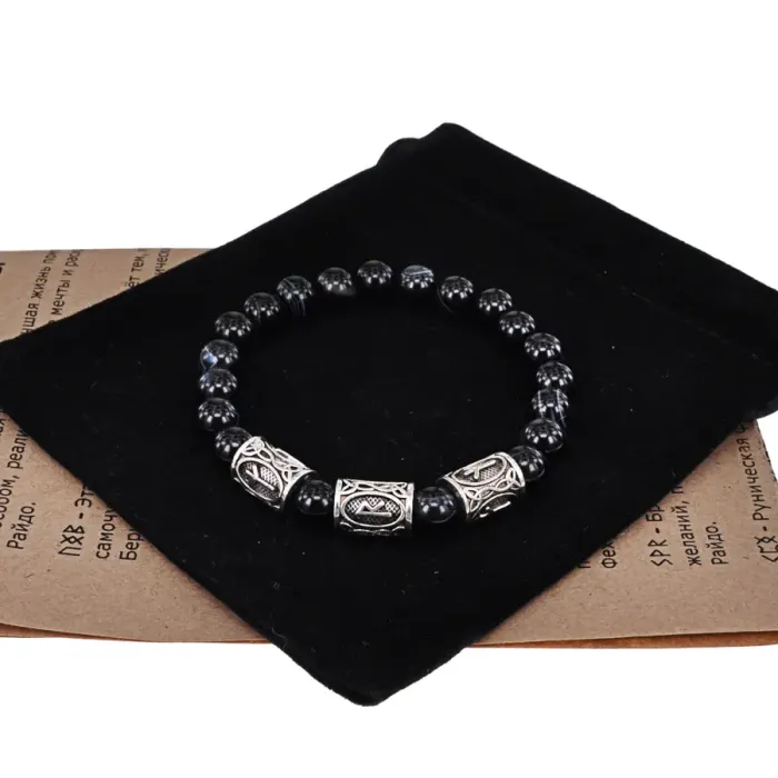 Рунический браслет из натурального камня черный агат с нанесенными символами рун.