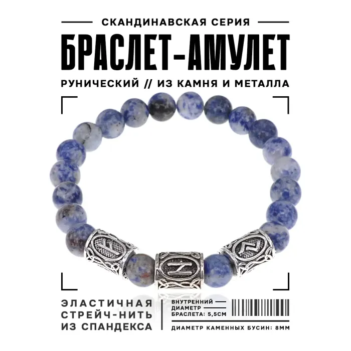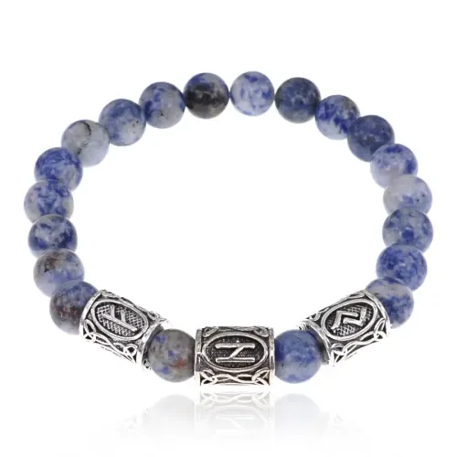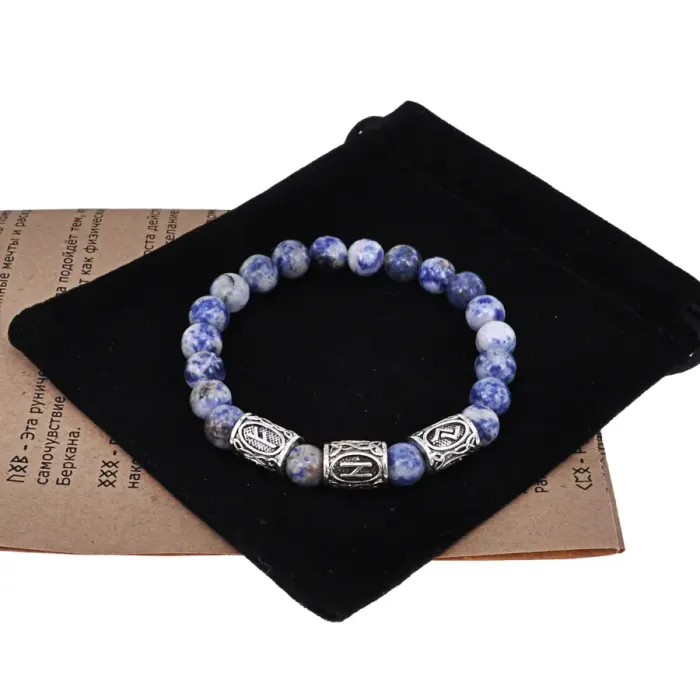 Рунический стрейч-браслет с символами Феху, Хагалаз и Йера из натурального камня содалит.