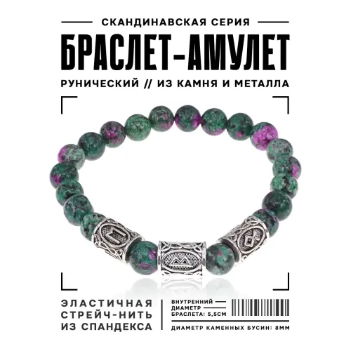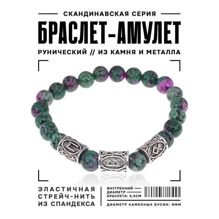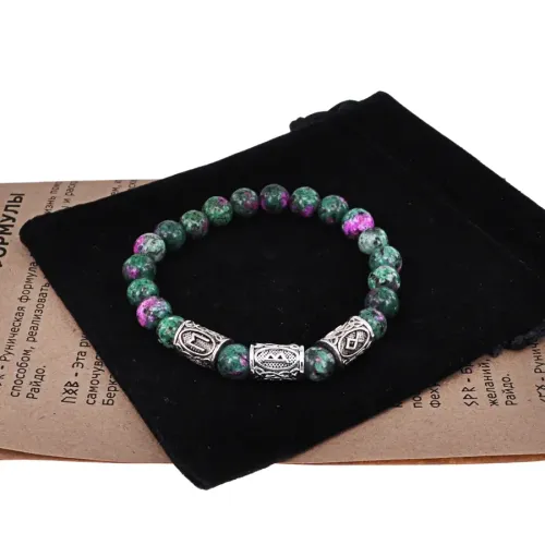 Рунический стрейч-браслет с бусинами из синтетического камня цоизит и символикой рун.