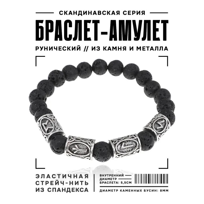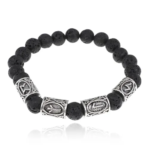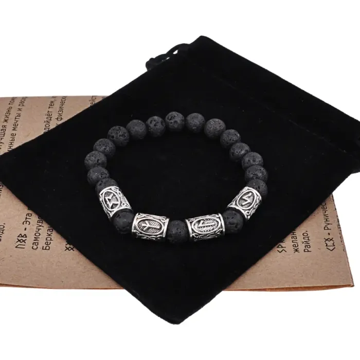 Рунический стрейч-браслет из камня лава (базальт) с нанесёнными символами рун.