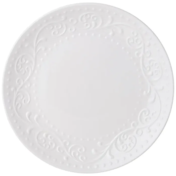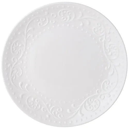 Тарелки изготовлены из фарфора Fine China, материала, сочетающего свойства традиционного фарфора и искусственного минерала. Поверхность украшена рельефным орнаментом. Конструкция с классическим диаметром и высотой борта подходит для подачи разнообразных блюд.