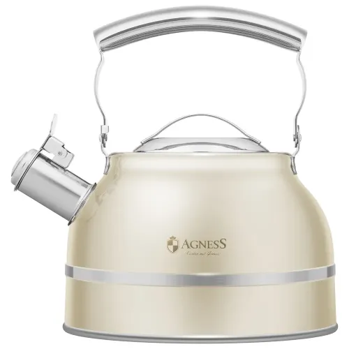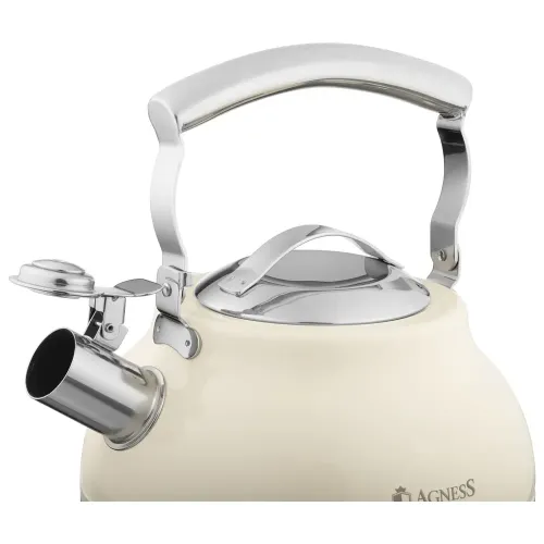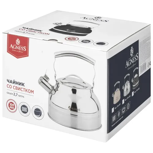 Чайник со свистком Agness объёмом 2,7 литра предназначен для нагрева воды на всех типах плит, включая индукционные. Изготовлен из нержавеющей хромоникелевой стали марки 18/8, он оснащён термоаккумулирующим дном и складывающейся ручкой.