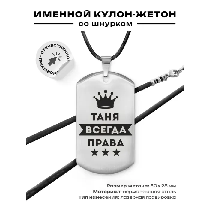 Жетон на шнурке "Всегда права" — это стильный и оригинальный аксессуар, выполненный из высококачественной полированной нержавеющей стали. Этот именной жетон символизирует уверенность и независимость, а также станет отличным подарком для тех, кто ценит индивидуальность. Основные особенности:
