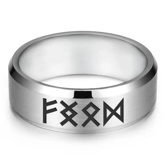 Кольцо с рунической формулой «Растущее благосостояние» из нержавеющей стали с лазерной гравировкой.