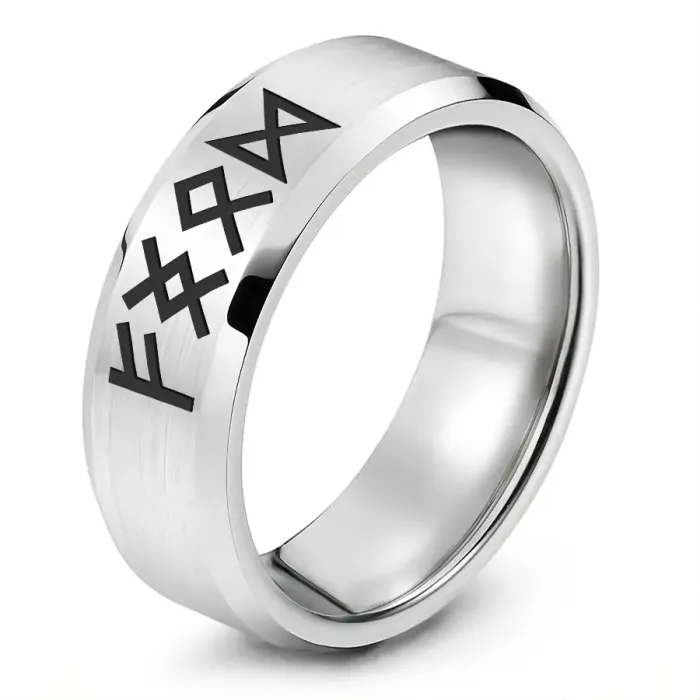 Кольцо с рунической формулой из нержавеющей стали с лазерной гравировкой.