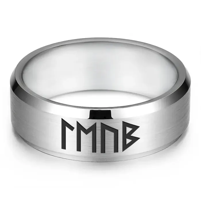 Кольцо-сувенир из нержавеющей стали с лазерной гравировкой рунической формулы.