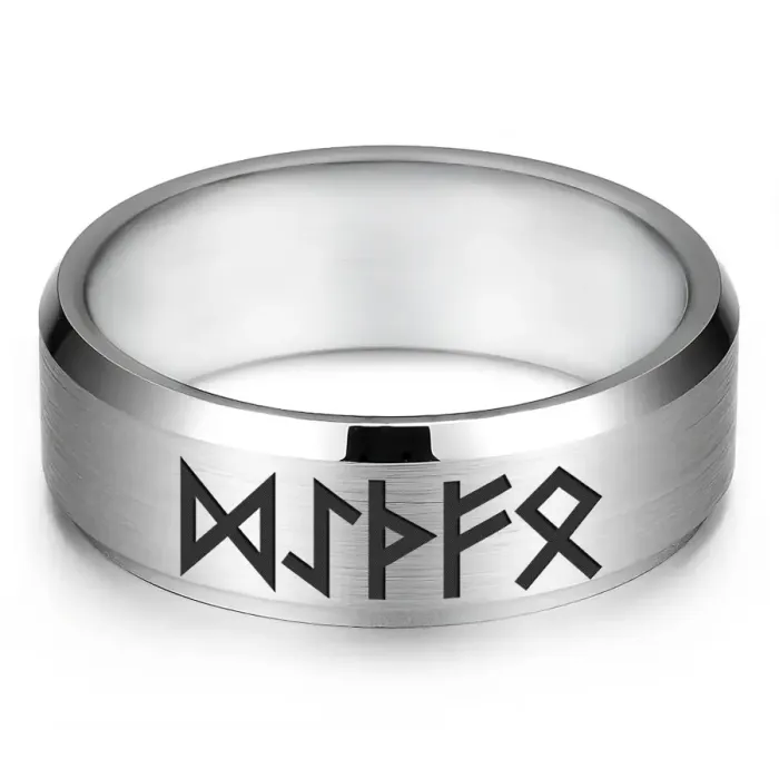Кольцо с рунической формулой Привлечение денег — сувенирный аксессуар из нержавеющей стали с лазерной гравировкой.