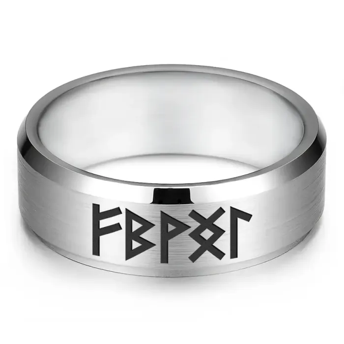Кольцо с рунической формулой, выполненное из нержавеющей стали с лазерной гравировкой.