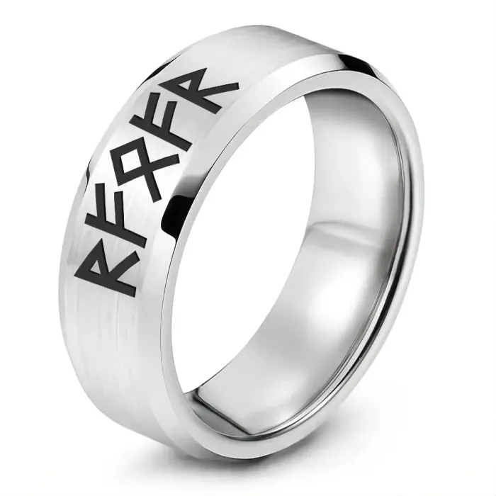 Кольцо с рунической формулой для обретения богатства. Изготовлено из нержавеющей стали, украшено лазерной гравировкой рун.
