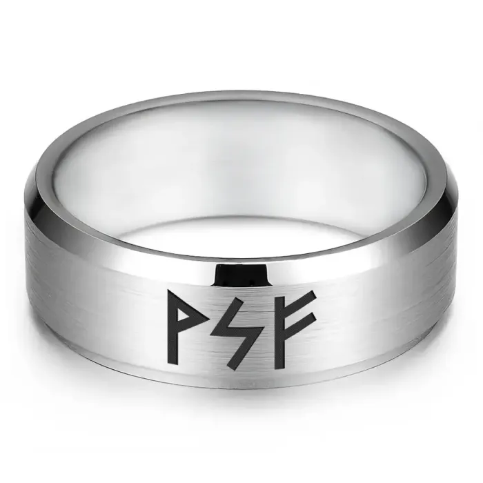 Кольцо с рунической формулой «Богатство на всех уровнях бытия» из нержавеющей стали с лазерной гравировкой.