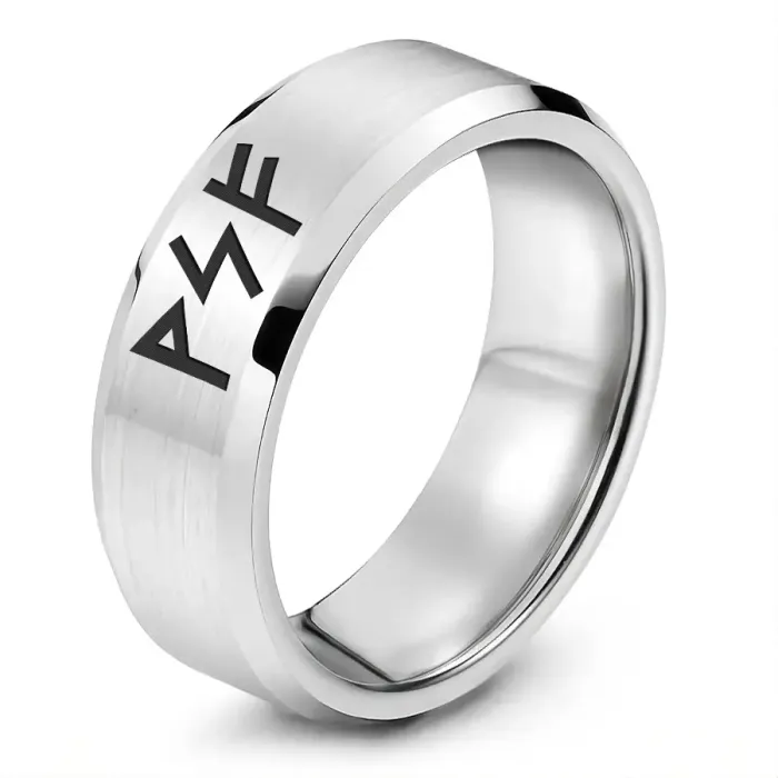 Кольцо с рунической формулой «Богатство на всех уровнях бытия» из нержавеющей стали с лазерной гравировкой.