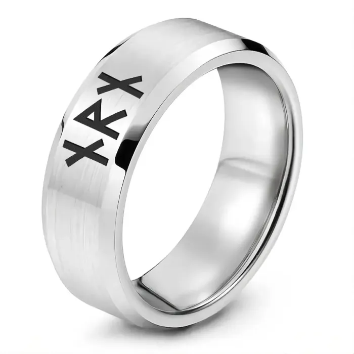 Кольцо с рунической формулой «Защита от колдовства» из нержавеющей стали с лазерной гравировкой.