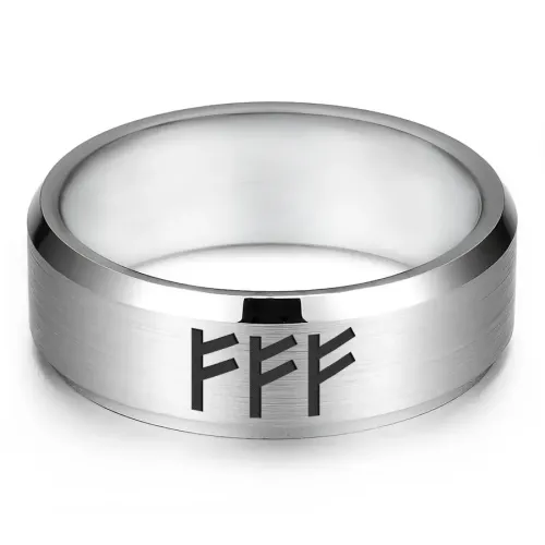 Кольцо с рунической формулой «Материальное благополучие» выполнено из нержавеющей стали с лазерной гравировкой.