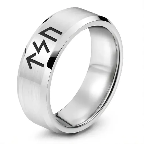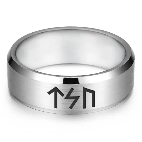 Кольцо с рунической формулой «Сила, энергия, достижение цели» изготовлено из нержавеющей стали с лазерной гравировкой.