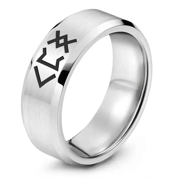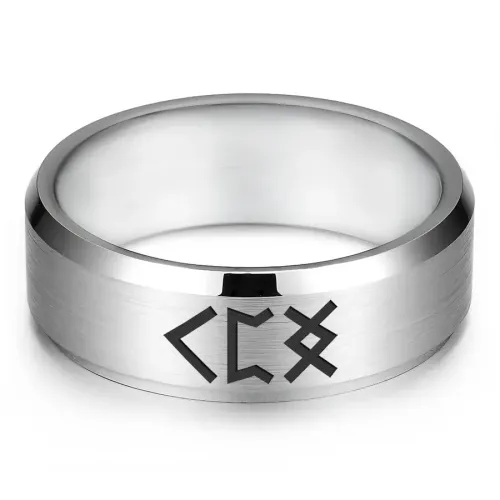 Кольцо с рунической формулой, выполненное из нержавеющей стали с лазерной гравировкой.