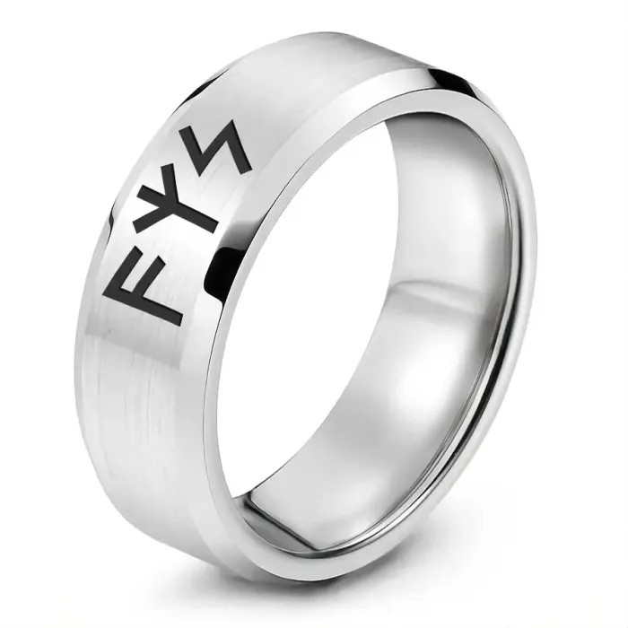 Кольцо с рунической формулой «Озарение» выполнено из нержавеющей стали с лазерной гравировкой.