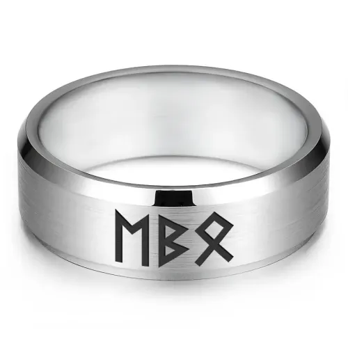 Кольцо с рунической формулой, выполненное из нержавеющей стали с лазерной гравировкой.