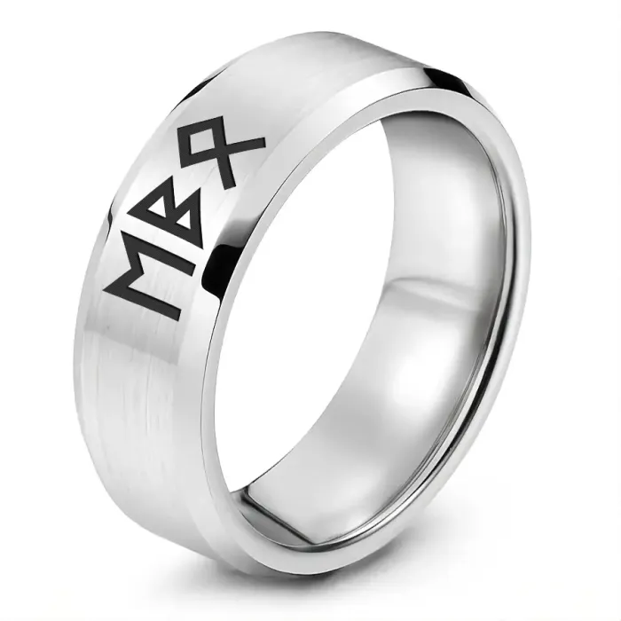 Кольцо с рунической формулой, выполненное из нержавеющей стали с лазерной гравировкой.