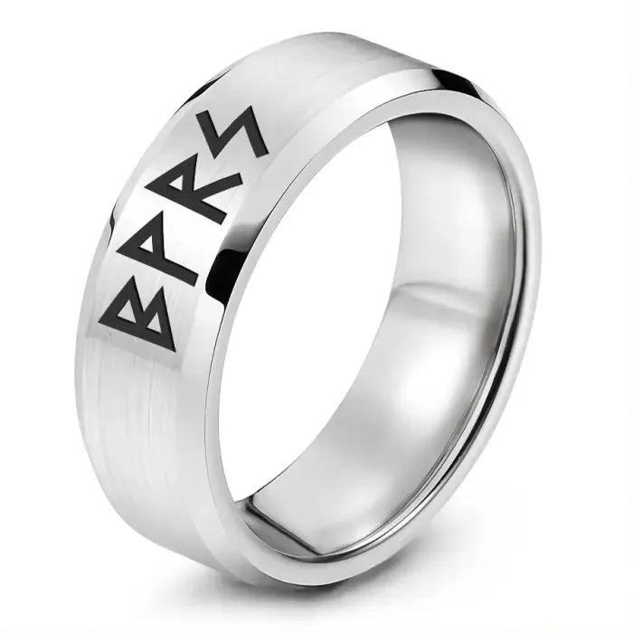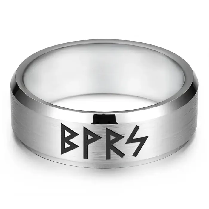 Кольцо с рунической формулой из нержавеющей стали с лазерной гравировкой.