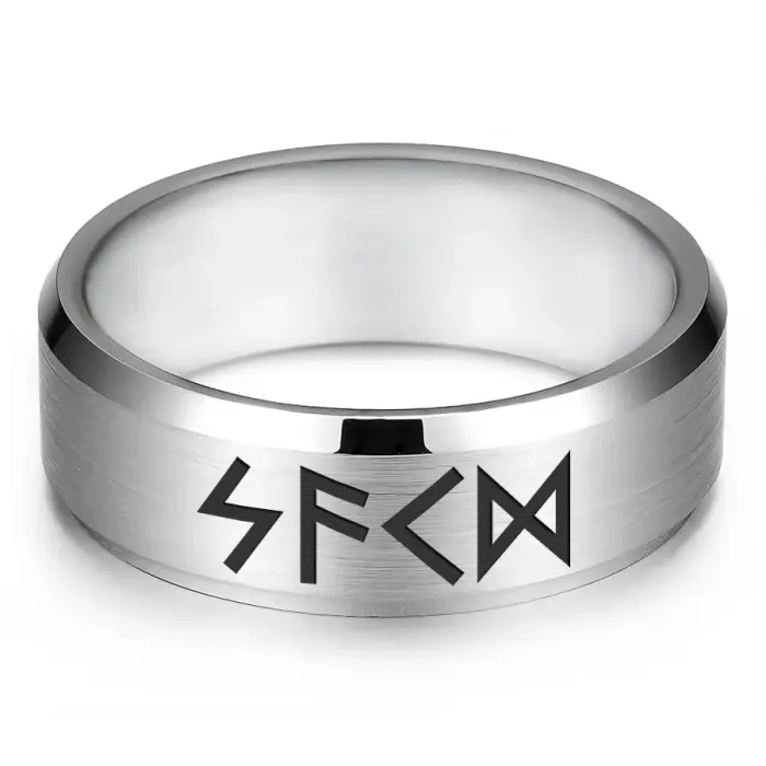 Кольцо с рунической формулой «Стремление к знаниям» из нержавеющей стали с лазерной гравировкой.