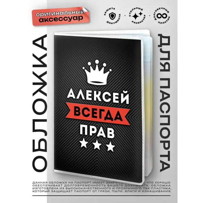 Обложка для паспорта с полиграфической вставкой «Алексей Всегда прав». Изготовлена из прозрачного ПВХ пластика.