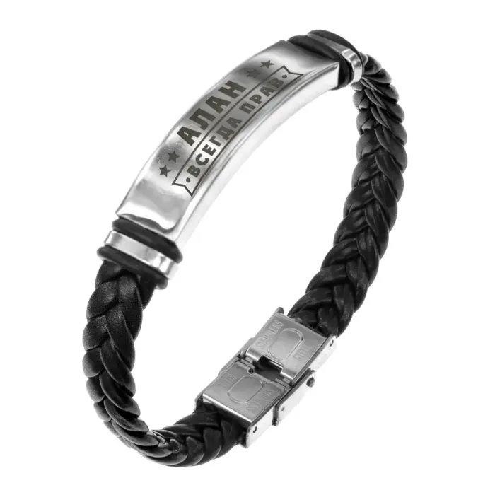 Именной браслет из кожи и нержавеющей стали с плетёной текстурой и гравировкой.