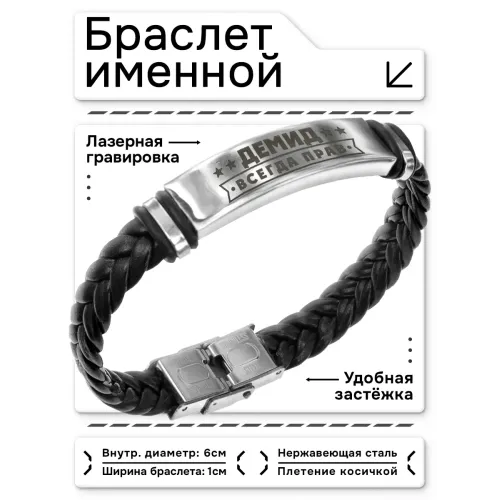 Именной браслет с гравировкой. Изготовлен из кожи и нержавеющей стали, имеет плетёный дизайн.