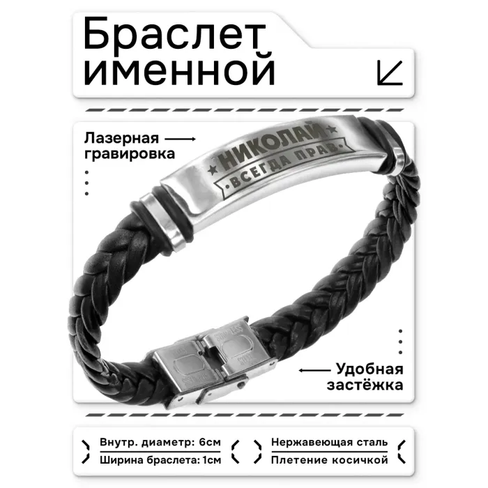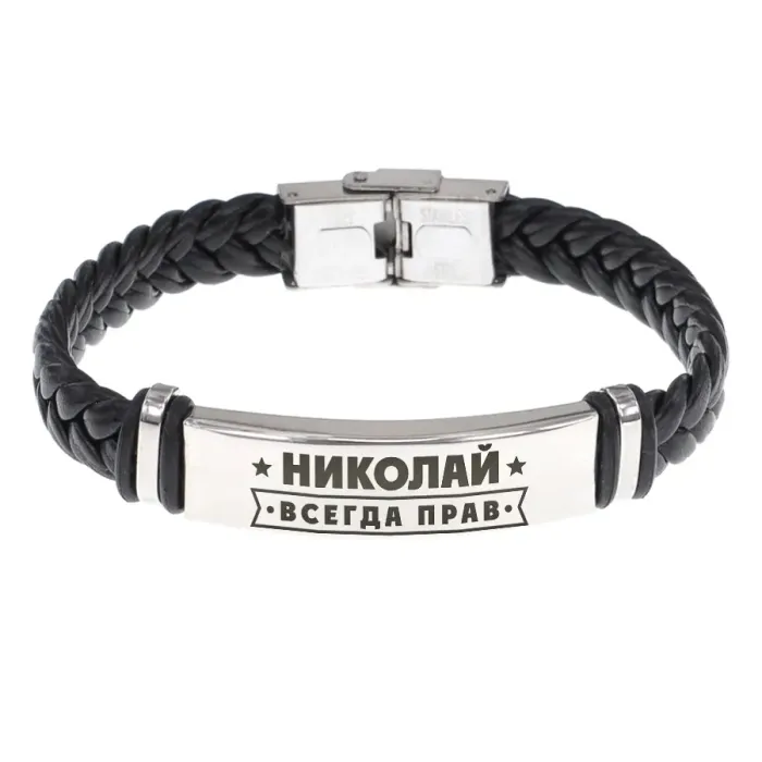 Именной браслет с гравировкой 'Всегда Прав'. Изготовлен из плетёной кожи и нержавеющей стали.