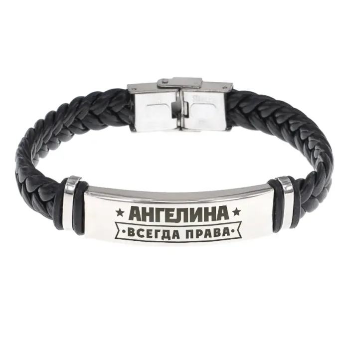 Именной браслет из кожи и нержавеющей стали с гравировкой.