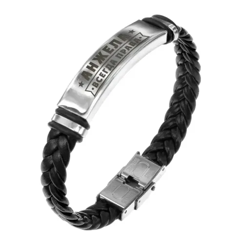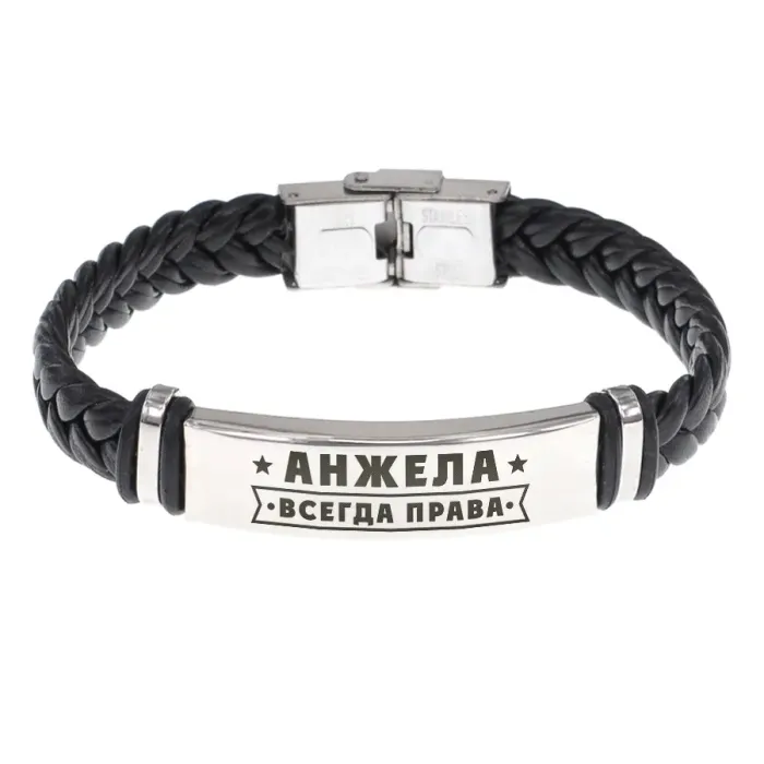 Именной браслет из кожи и нержавеющей стали с гравировкой.