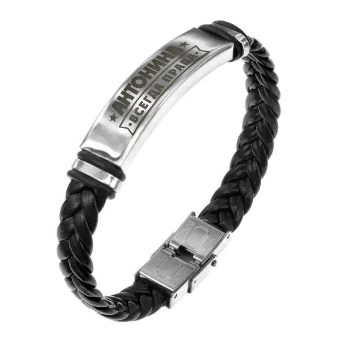 Именной браслет с гравировкой. Изготовлен из кожи и нержавеющей стали, имеет плетёную структуру.