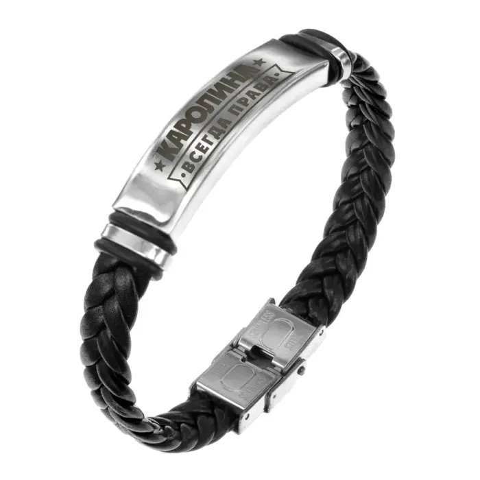 Именной браслет из кожи и нержавеющей стали с плетёной текстурой и гравировкой.