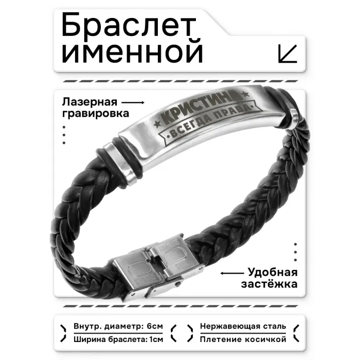 Именной браслет с гравировкой. Изготовлен из кожи и нержавеющей стали, имеет плетёную текстуру.