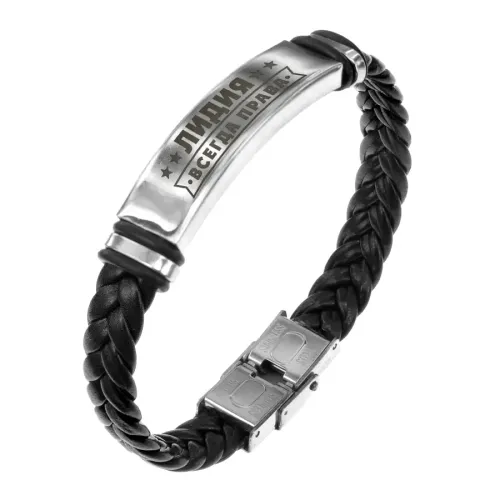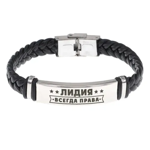 Именной браслет «Лидия» с гравировкой «Всегда права». Изготовлен из кожи и нержавеющей стали, имеет плетёную структуру.