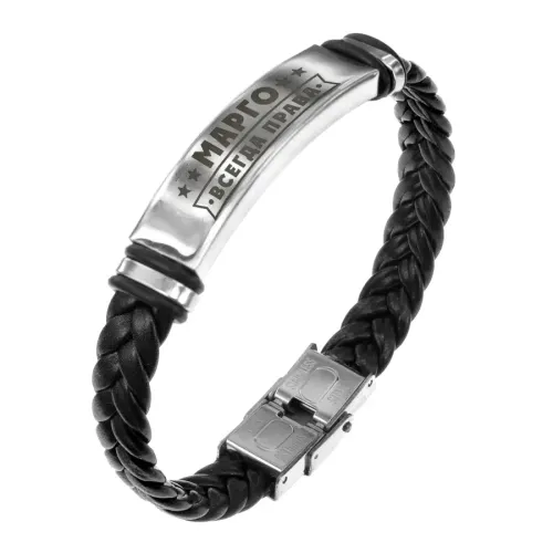 Именной браслет с гравировкой «Всегда права». Изготовлен из кожи и нержавеющей стали, имеет плетёную текстуру.