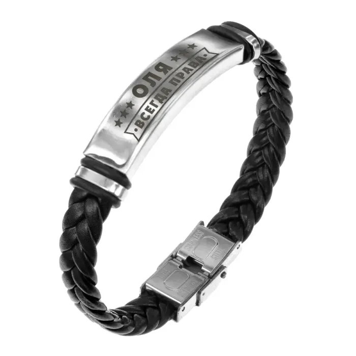 Именной браслет с гравировкой «Всегда права» из кожи и нержавеющей стали с плетёной текстурой.